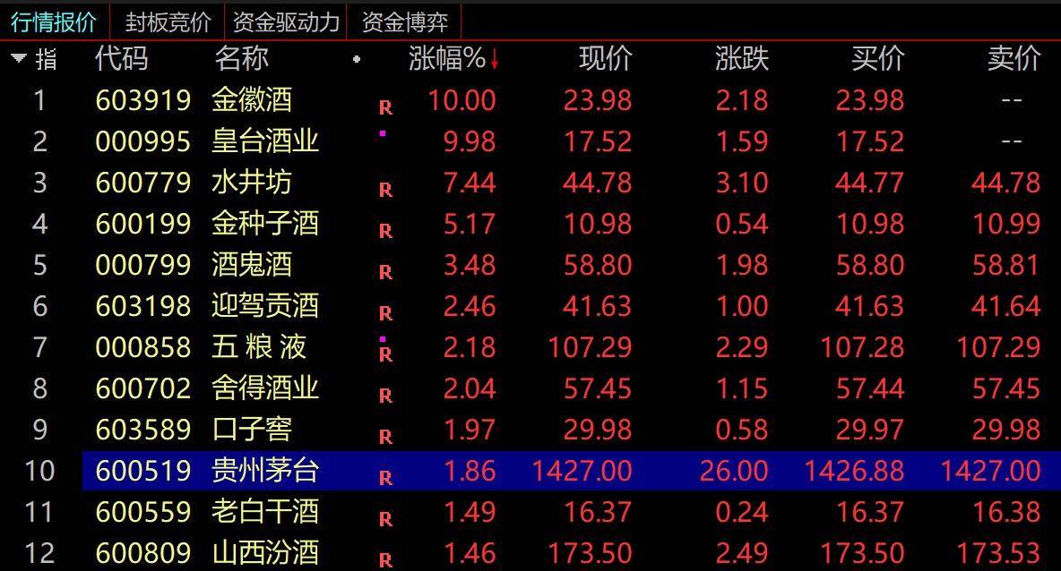 上周四,市场高位分化时,白酒股曾上演涨停潮,贵州茅台亦大涨9%,今日再次挺身而出,显示了其A股“股王”作用。