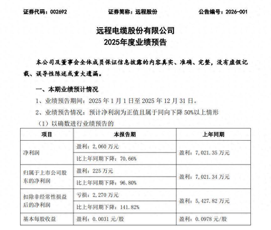 近日,远程股份(002692.SZ)发布2025年度业绩预告,报告期内,归属于上市公司股东的净利润225万元,同比下降96.80%;扣除非经常性损益后的净利润为亏损2,270万元,上年同期盈利5,427.82万元;基本每股收益0.0031元/股。