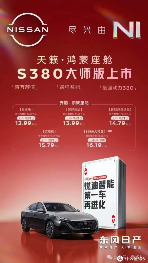 价格方面,天籁鸿蒙座舱家族共推出5款配置,官方指导价13.99万-18.29万元,上市限时价直接下探到12.99万-16.19万元。