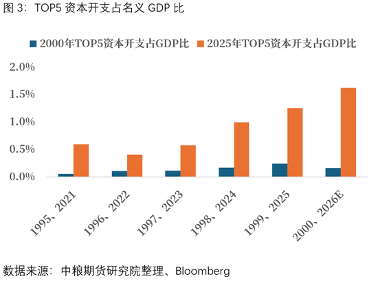 另一处与2000年互联网革命的区别是,本轮AI投资的集中度显著高于上一轮。如果将2000年规模TOP5(微软、Oracle、亚马逊、思科、英特尔)与本轮AI革命TOP5(微软、Oracle、亚马逊、谷歌、Meta)进行对比,可以发现根据财报及财报披露会上宣布的未来资本开支计划上,本轮巨头投资占比,要远高于上一轮。